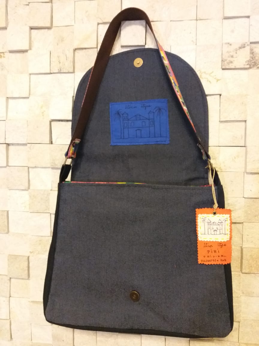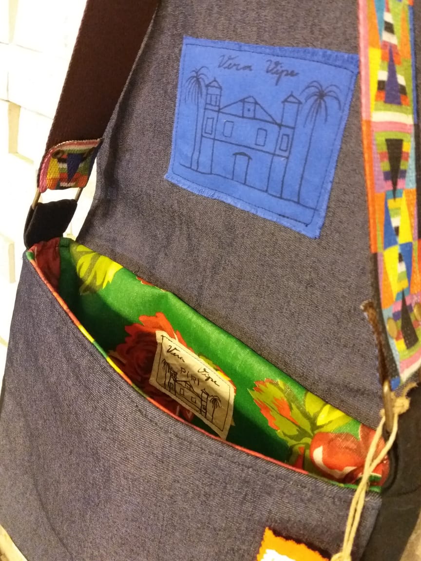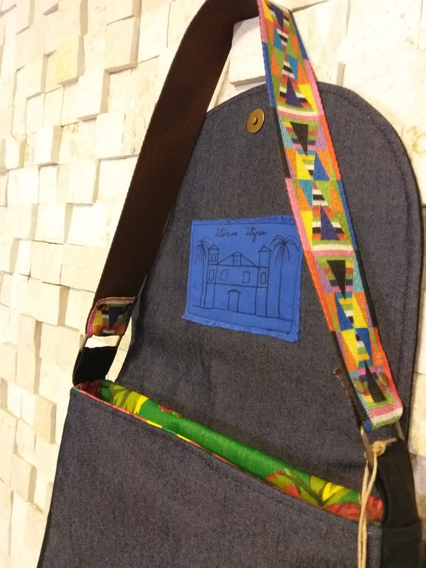 Feita em jeans com forro de Chita remetendo às roupas dos Mascarados de Pirenópolis. Bordado feito à mão, alça étnica.