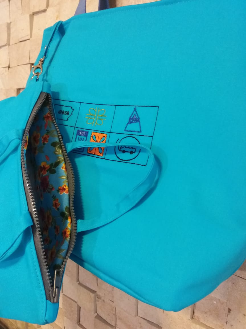R$ 178,90Feita em brim, azul royal, alça dupla de ombro, vêm com bolsinha destacável estilo refil, forro em chita, traz na parte da frente a iconografia de Brasília, bordada à máquina.