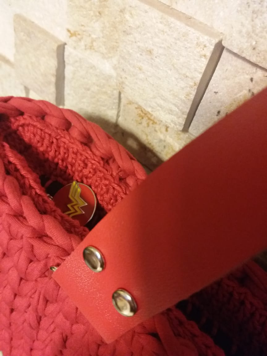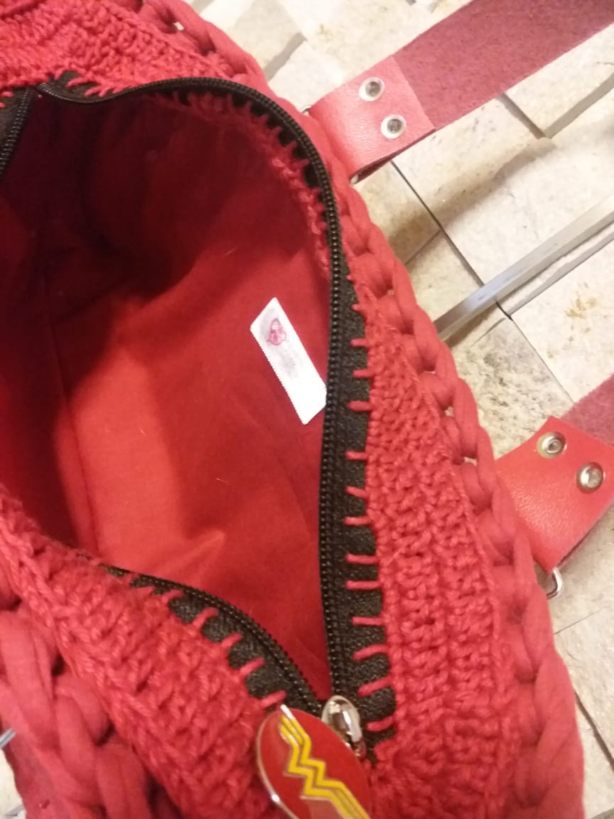 Feita em crochê com fio de malha, bolsa de mão na cor vermelha, com puxador de zíper personalizado e alça em couro ecológico.